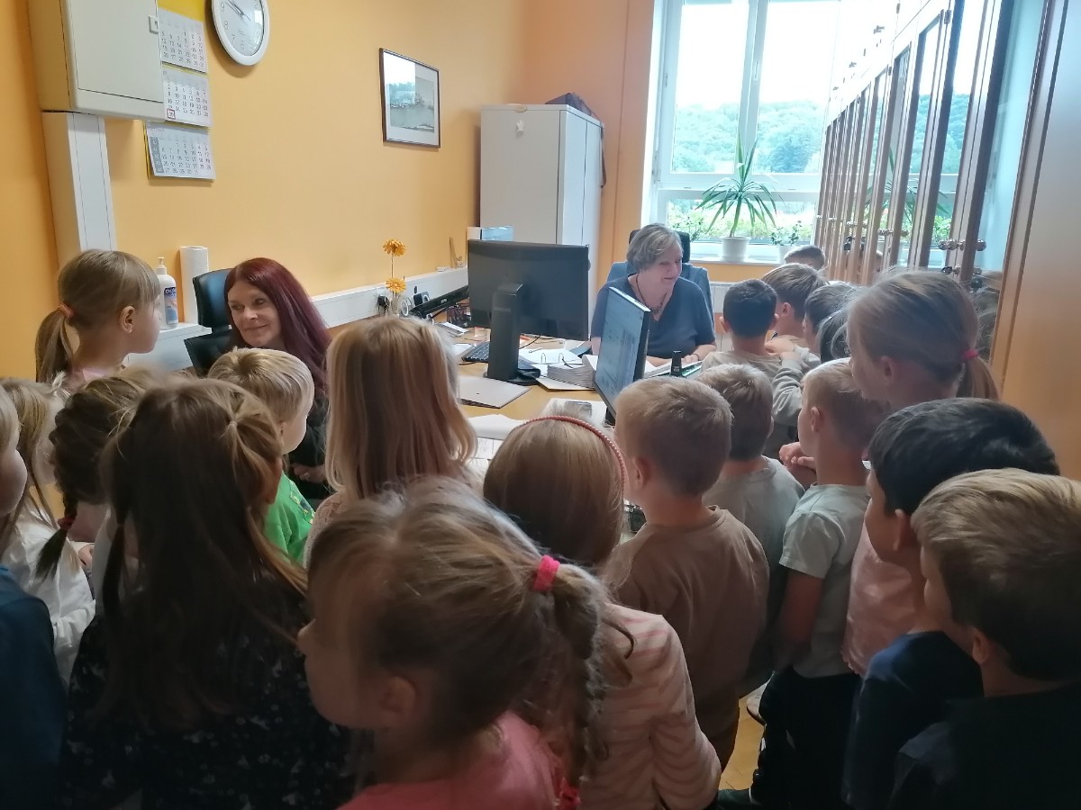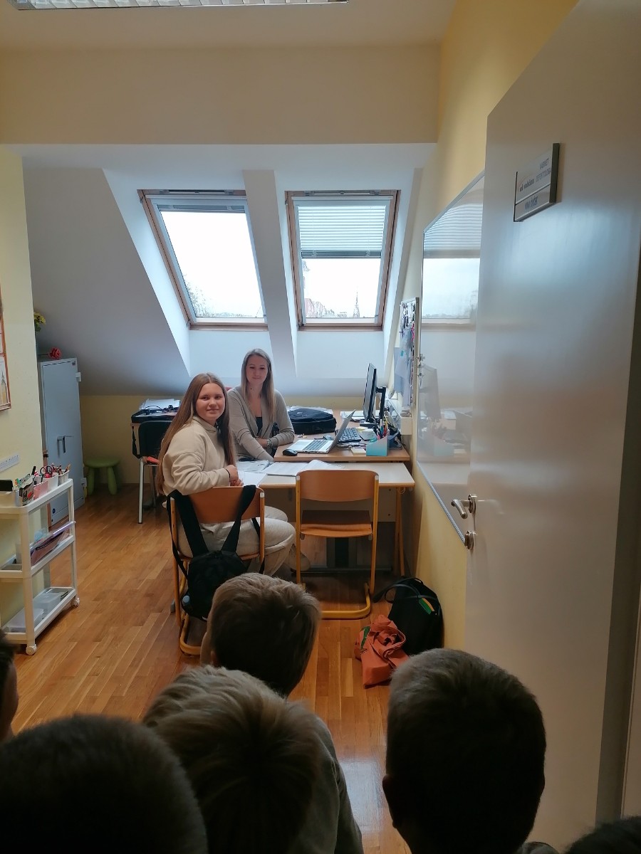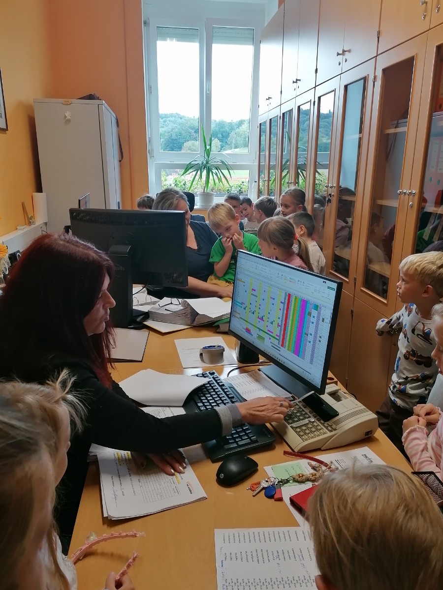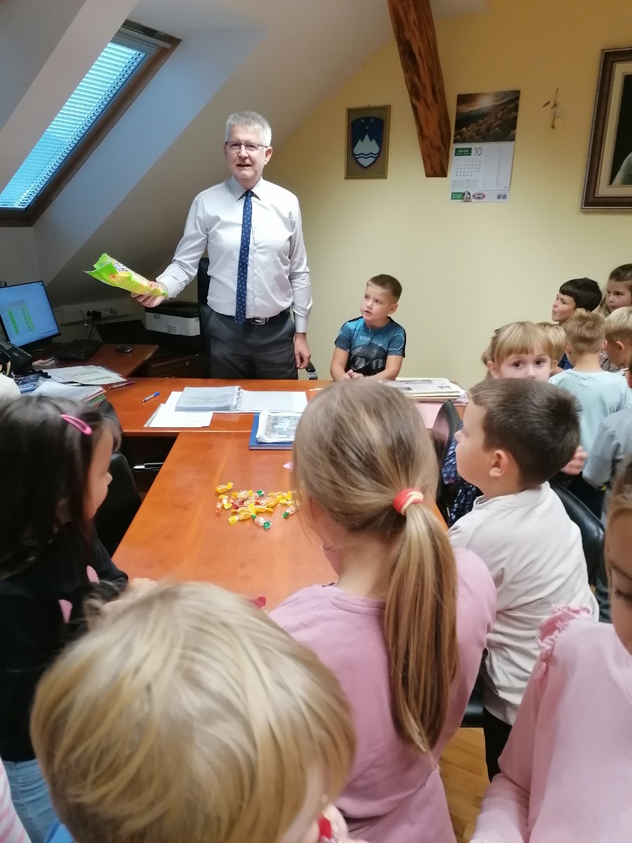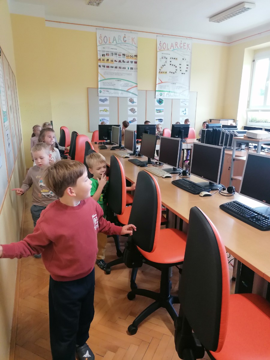 Prvošolci pri urah spoznavanja okolja trenutno spoznavajo našo šolo, zato smo se odpravili na ogled. Pričeli smo najvišje, kjer je pisarna gospoda ravnatelja. Ta je bil našega obiska zelo vesel, prav tako tudi učenci, saj je odgovoril na vsa njihova vprašanja. Spoznali smo tudi delo tajnice Vesne, pomočnice ravnatelja učiteljice Simone, pokukali v kabinet k učiteljici Anuški ter učiteljici Sanji ter si ogledali zbornico, kjer se zbiramo učitelji in se pripravljamo na delo. Učenci so ta prostor po svoje poimenovali zbiralnica. Zavili smo tudi v računalniško učilnico k učitelju Daniju, v računovodstvo ter si ogledali še učilnice za geografijo, gospodinjstvo, glasbo, tehniko itd. Seveda nismo mogli mimo kleti, kamor učenci le redko zaidejo in ki skriva veliko zanimivih stvari.
