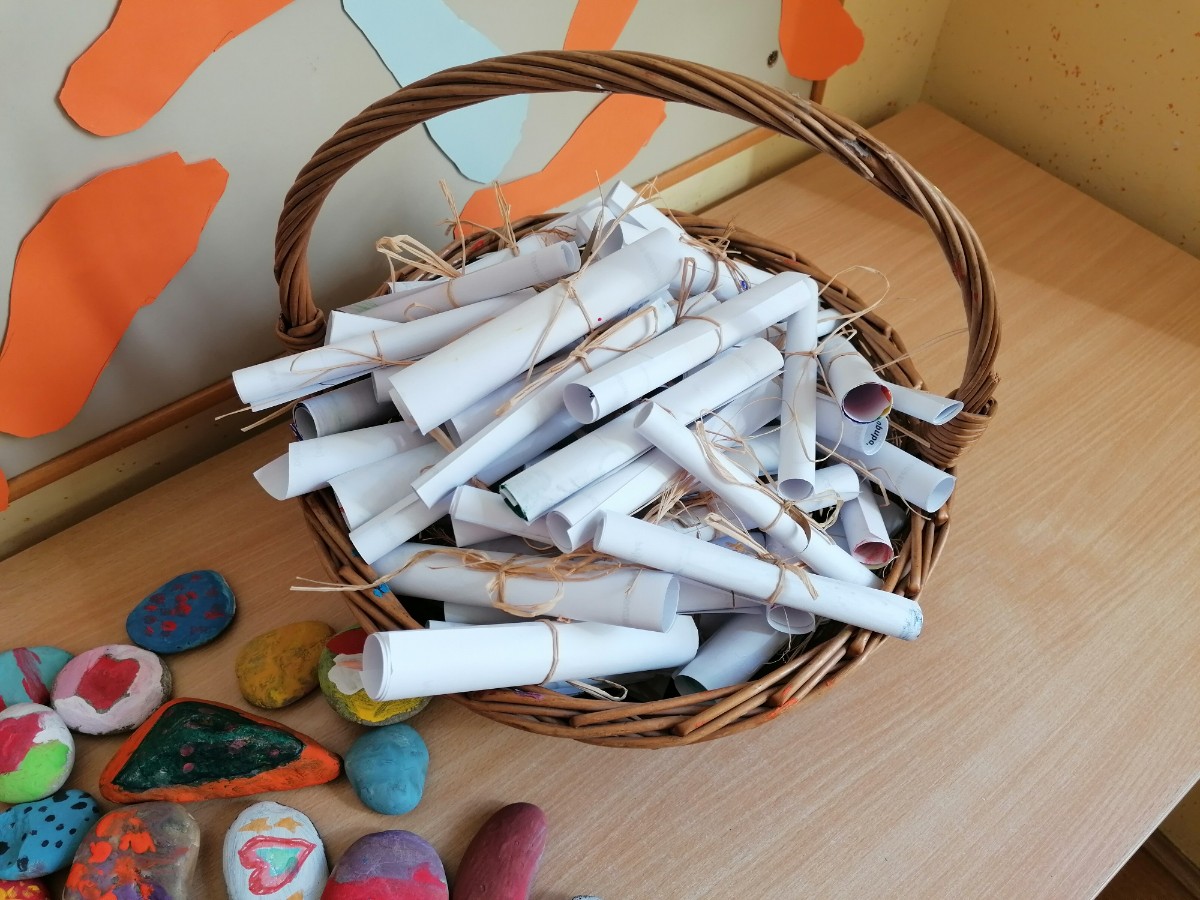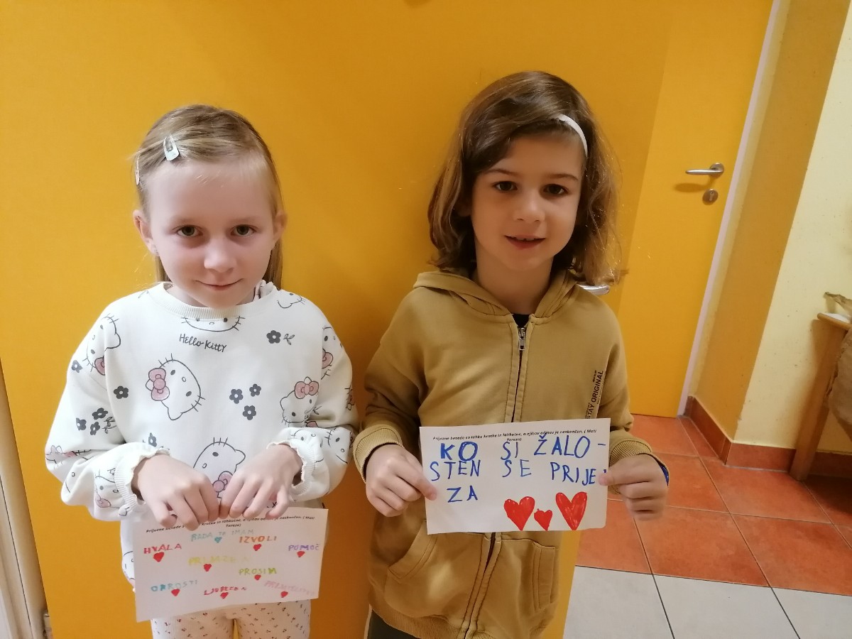Letošnji teden otroka je v ospredje postavil prijaznost in lepe besede. V ponedeljek smo se veliko pogovarjali o tej prijazni besedi, pisali lepe misli o prijaznosti in slikale kamenčke prijaznosti.