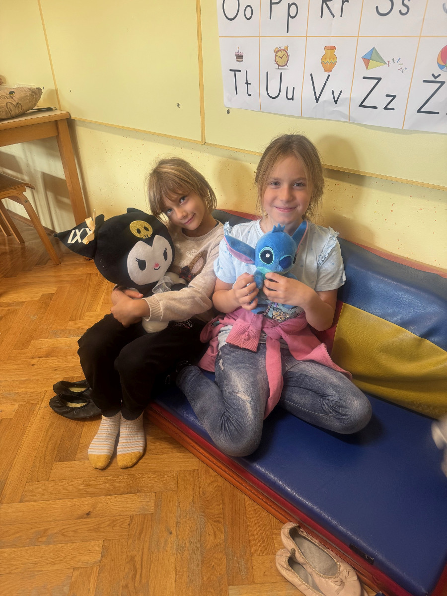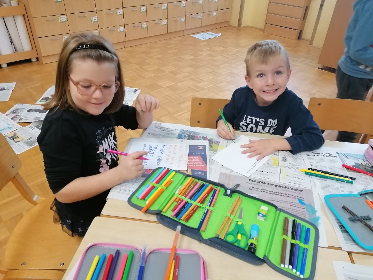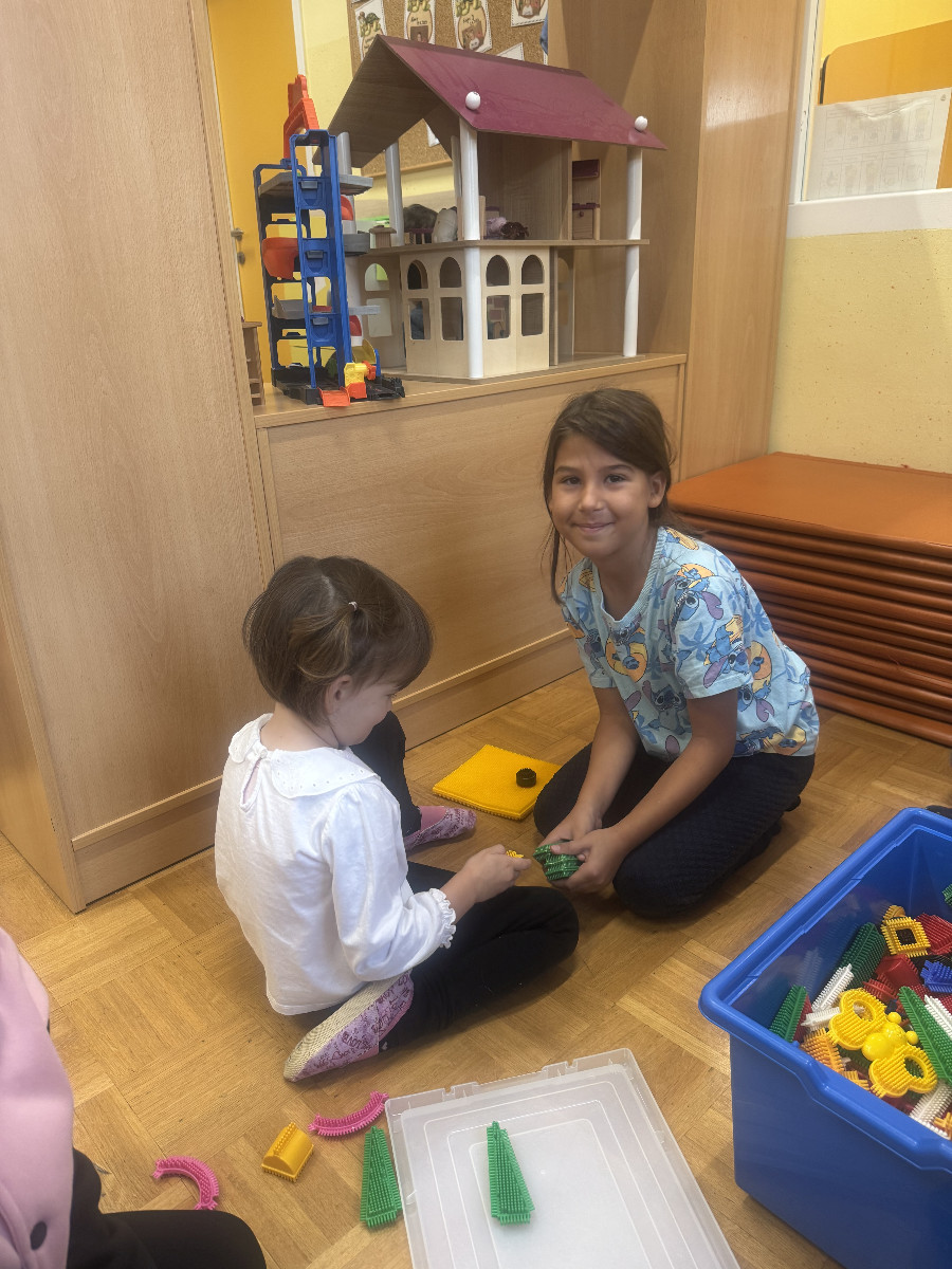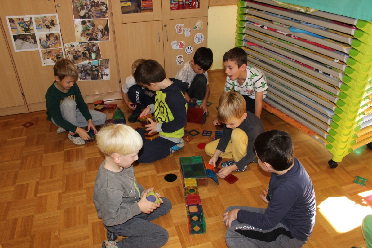 Prvošolci so se danes razveselili starih prijateljev, prijaznih besed, zanimivih igrač in proste igre. Lepe in prijazne trenutke so preživeli z otroki skupine Utrinki.