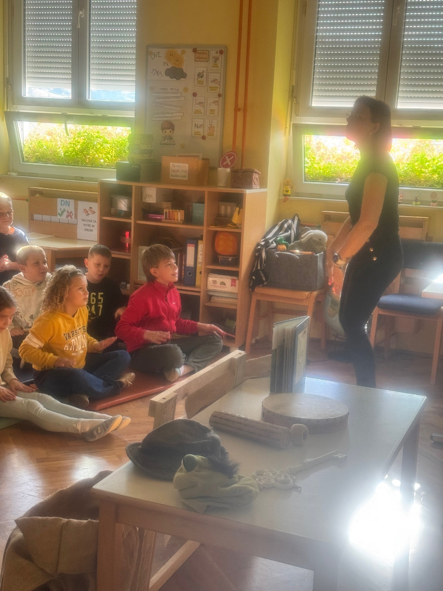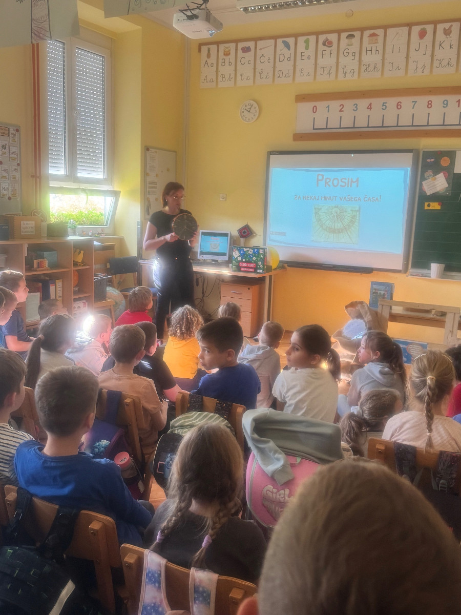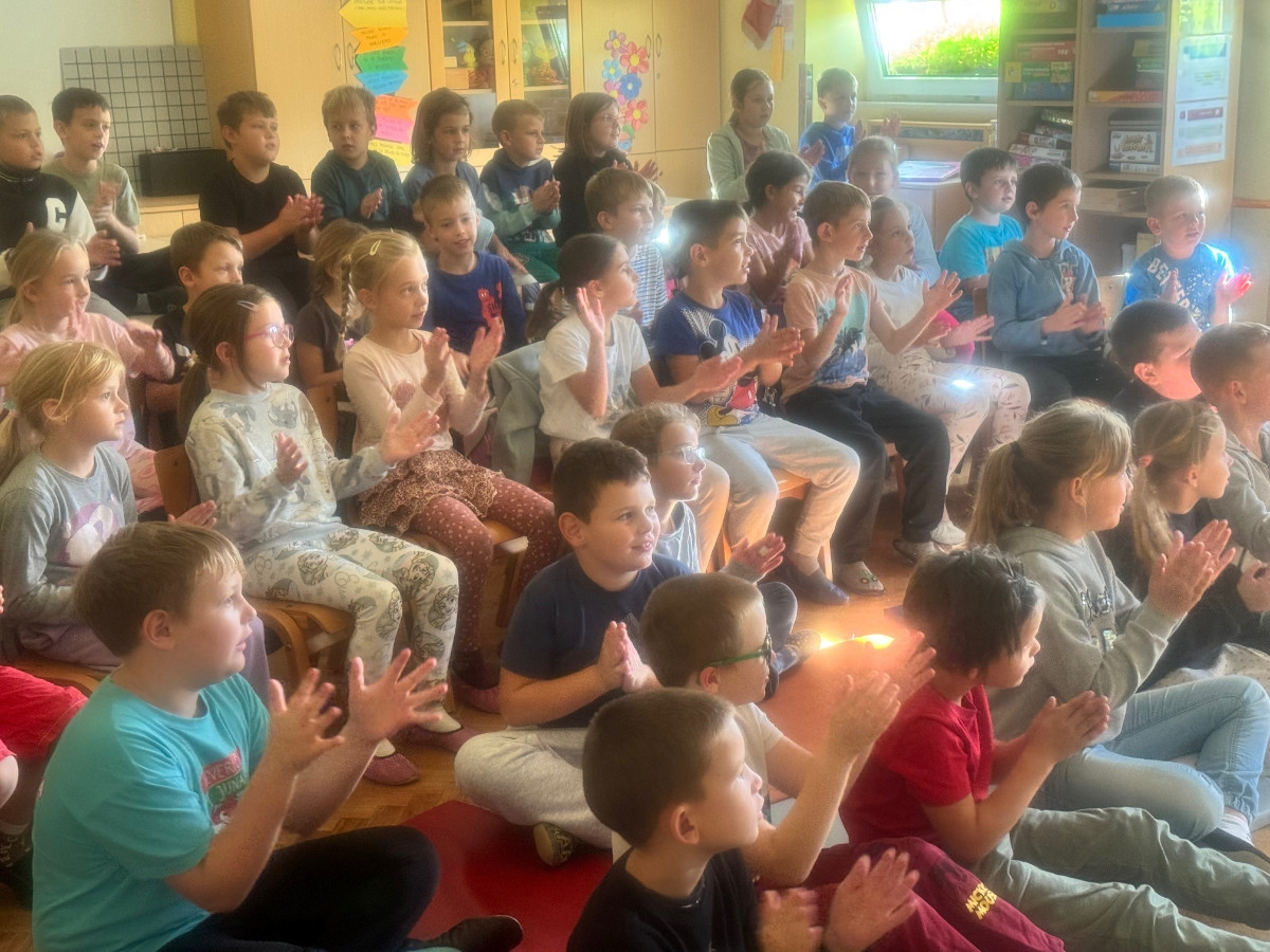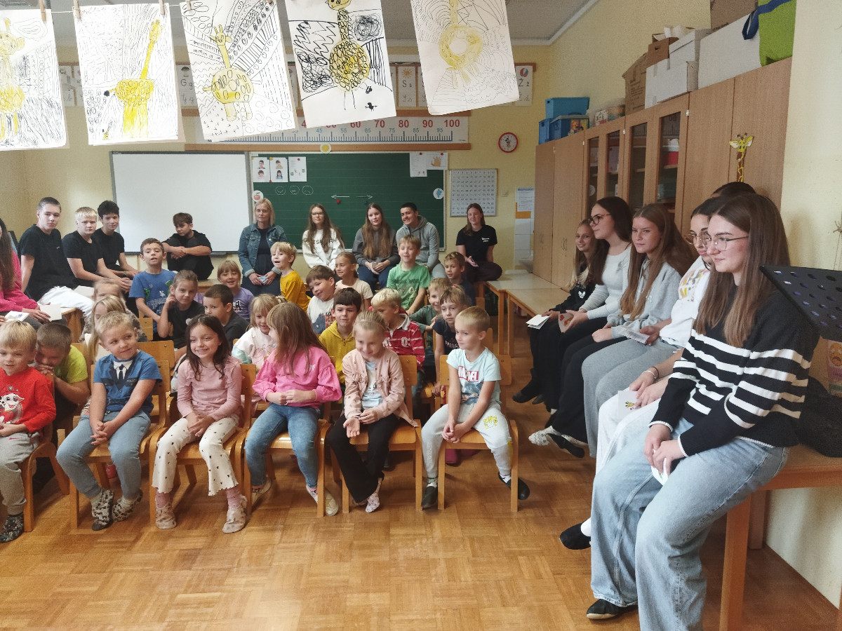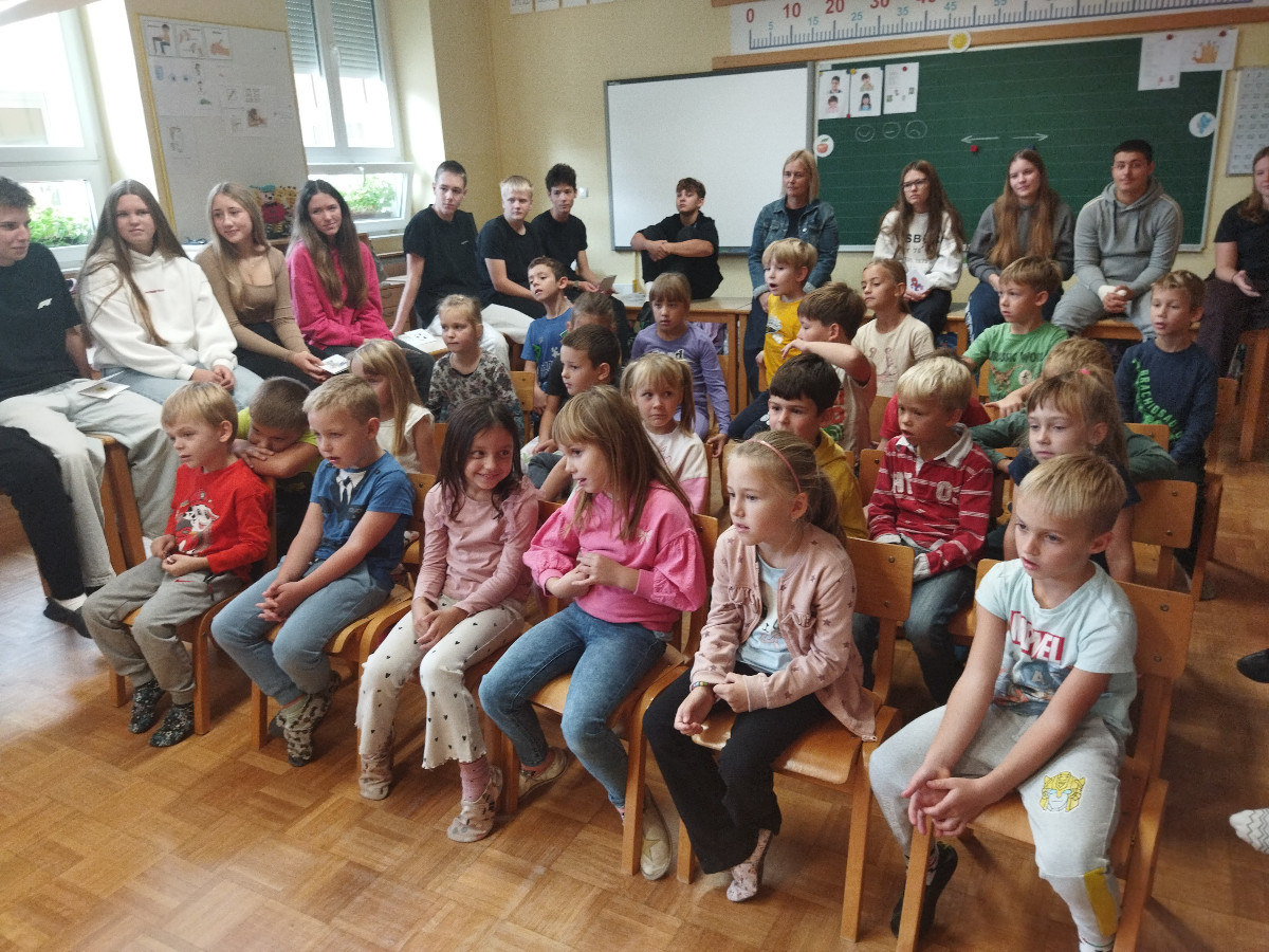 V četrtek, 9. 10. 2025, so v sklopu sprejema prvošolcev v šolsko skupnost devetošolci za naše najmlajše šolarje pripravili poleg igranja na inštrumente tudi bralno presenečenje. Žiga jim je prebral pravljico, ki jim je odprla oči za pomembno sporočilo, da si je stvari potrebno deliti.