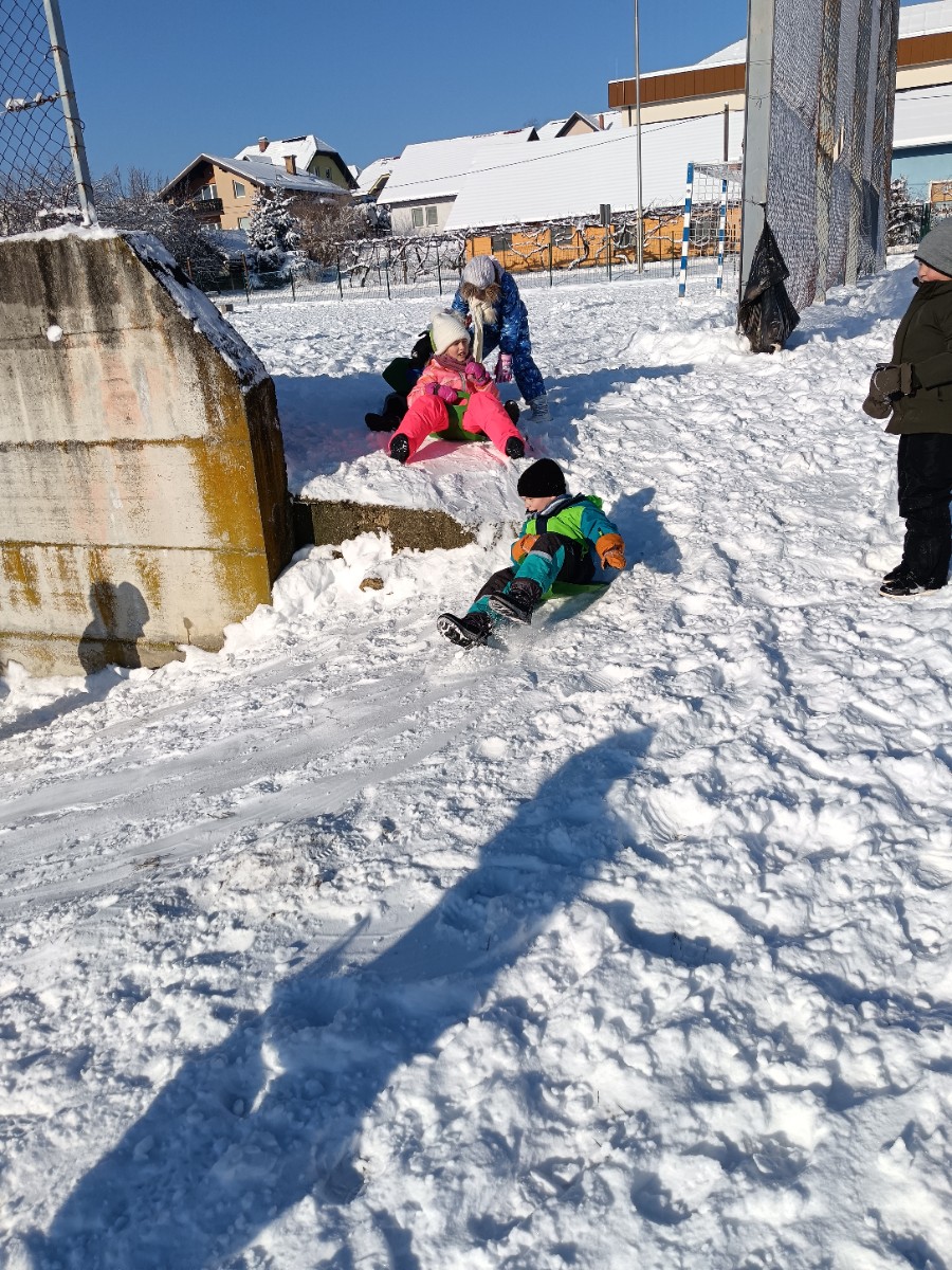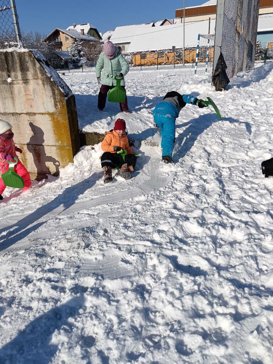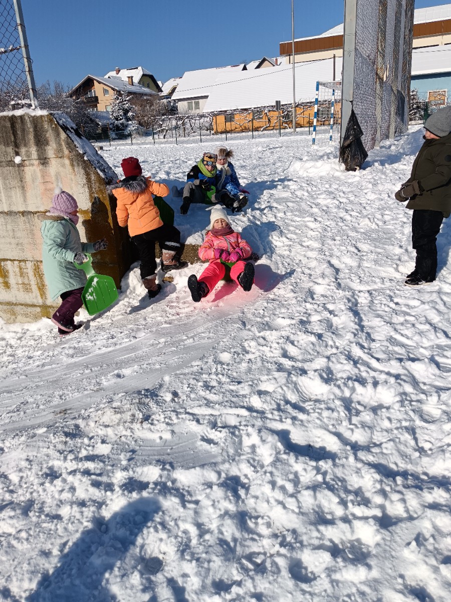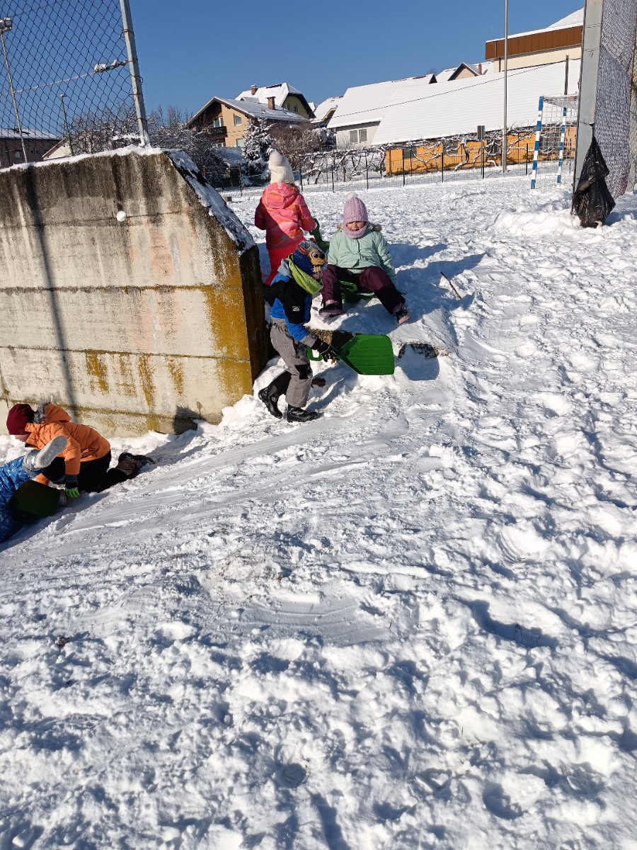 Pa smo ga dočakali. Sneg, ki pri otrocih nariše iskrene, nagajive, igrive nasmeške na obraz, pri odraslih pa sproži malce nelagodja ob mislih na zasnežene ceste. Prvošolci so se ga res zelo razveselili in v zimskih radostih uživali na polno. Ni zmanjkalo energije ob podenju po snegu, kepanju, gradnji gradov in seveda lopatkanju. Pripravili so si odlično progo, za katero so skrbeli posebni vzdrževalci. Bilo je veliko smeha in obilo zabave, zato upamo, da nam bo zima postregla še s kakšno pošiljko snega.