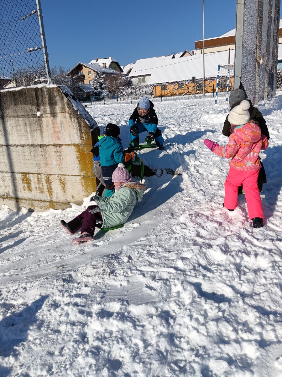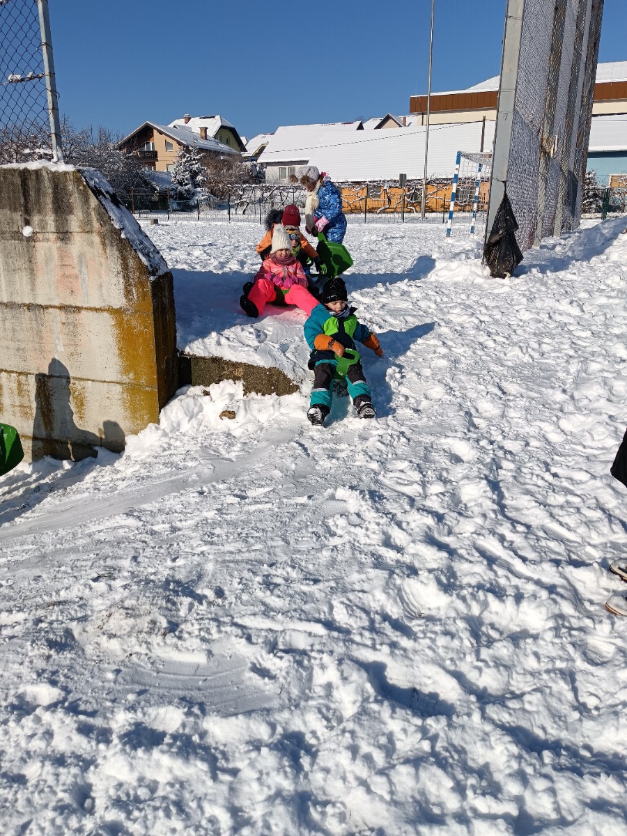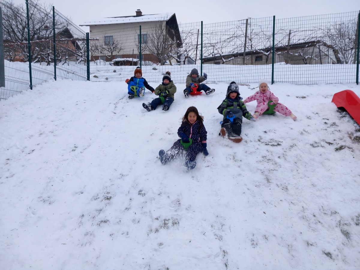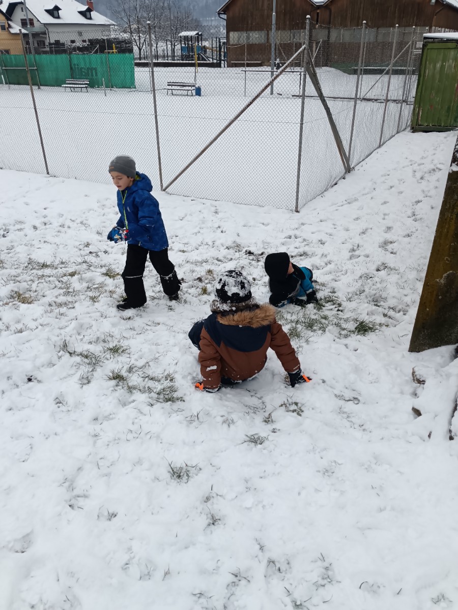 Pa smo ga dočakali. Sneg, ki pri otrocih nariše iskrene, nagajive, igrive nasmeške na obraz, pri odraslih pa sproži malce nelagodja ob mislih na zasnežene ceste. Prvošolci so se ga res zelo razveselili in v zimskih radostih uživali na polno. Ni zmanjkalo energije ob podenju po snegu, kepanju, gradnji gradov in seveda lopatkanju. Pripravili so si odlično progo, za katero so skrbeli posebni vzdrževalci. Bilo je veliko smeha in obilo zabave, zato upamo, da nam bo zima postregla še s kakšno pošiljko snega.