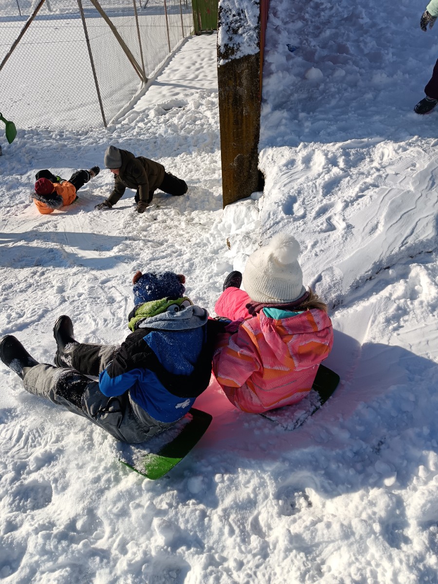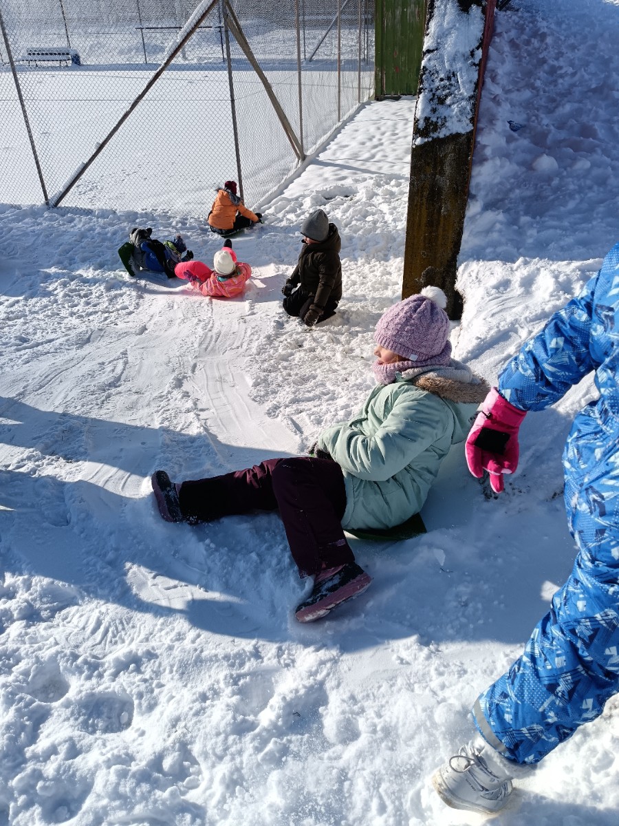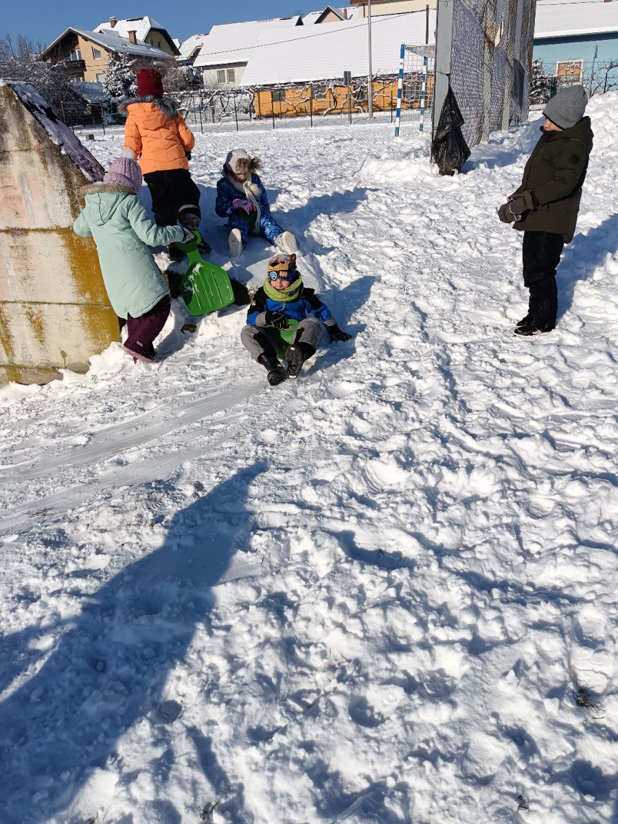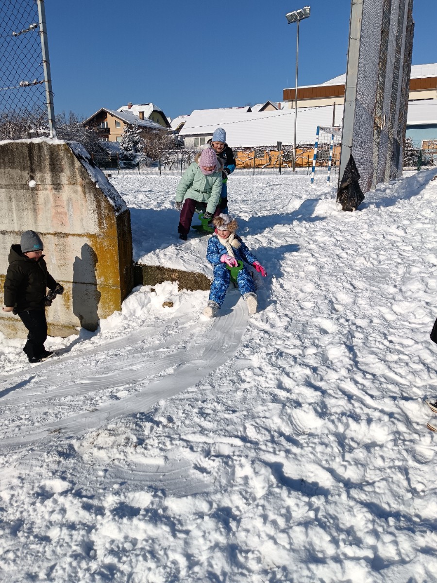 Snežna belina in vabljivi sončni žarki so tudi četrtošolce privabili na bele griče, kjer so si resnično dali duška. Radostni otroški glasovi, smeh in kriki navdušenja so se slišali daleč naokoli. Razigrani igri tudi nizke temperature in padci niso bili kos. Še več snega, prosimo! Zima je zakon.