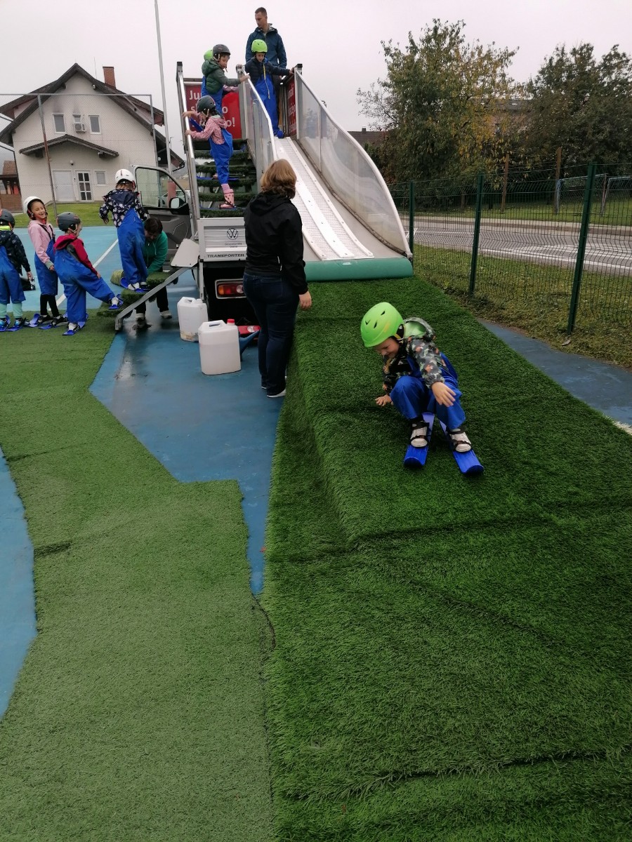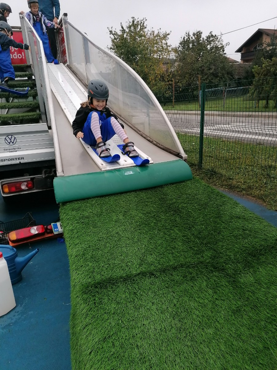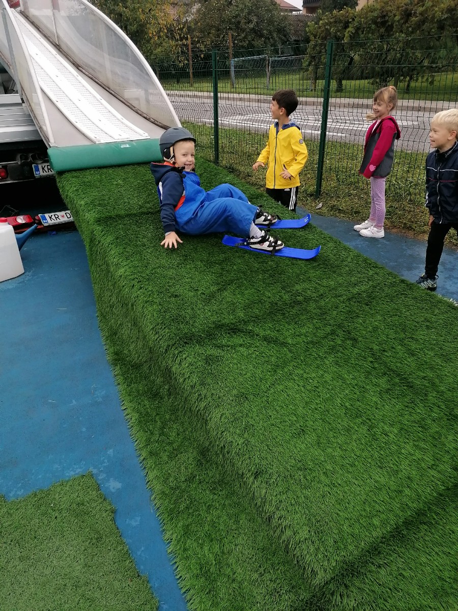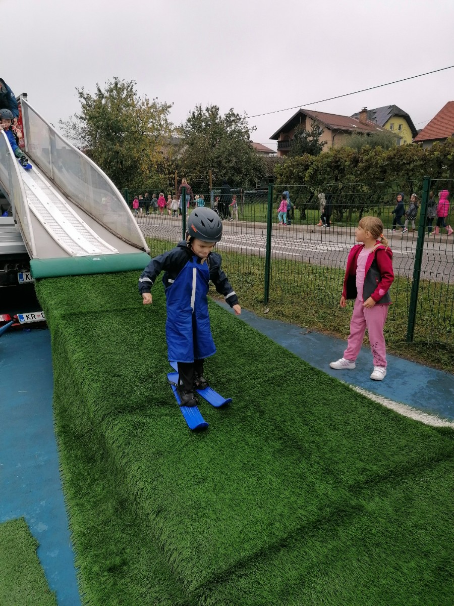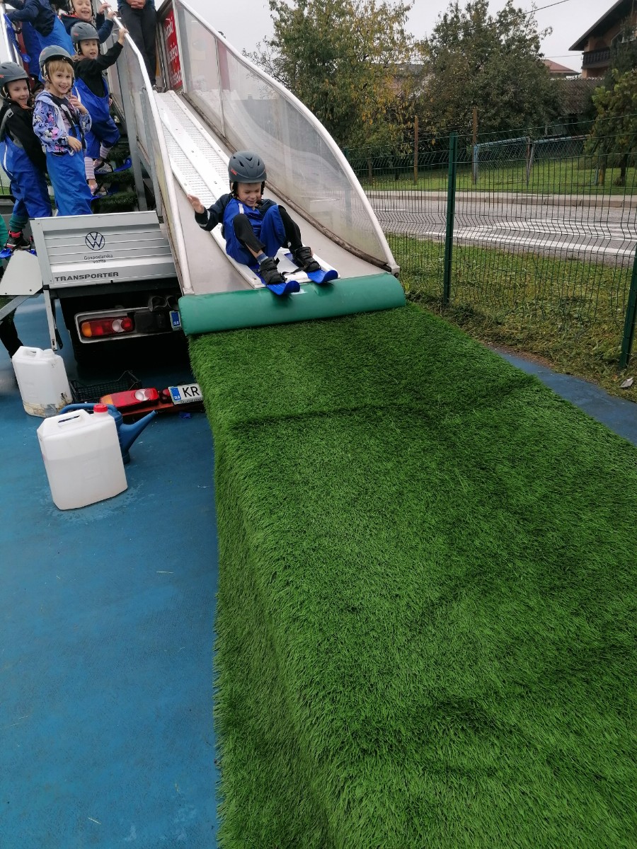 Deževno vreme nas danes ni prav nič oviralo. Mini Planica se je uspešno priselila k nam. Učenci so se pogumno povzpeli na skakalnico in se spustili po njej. Vsi so varno pristali, le redki na nogah, večina pa na ritkah. Priznati pa moramo, da so zelo uživali.