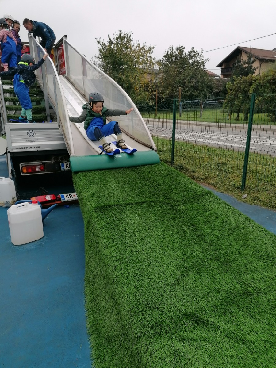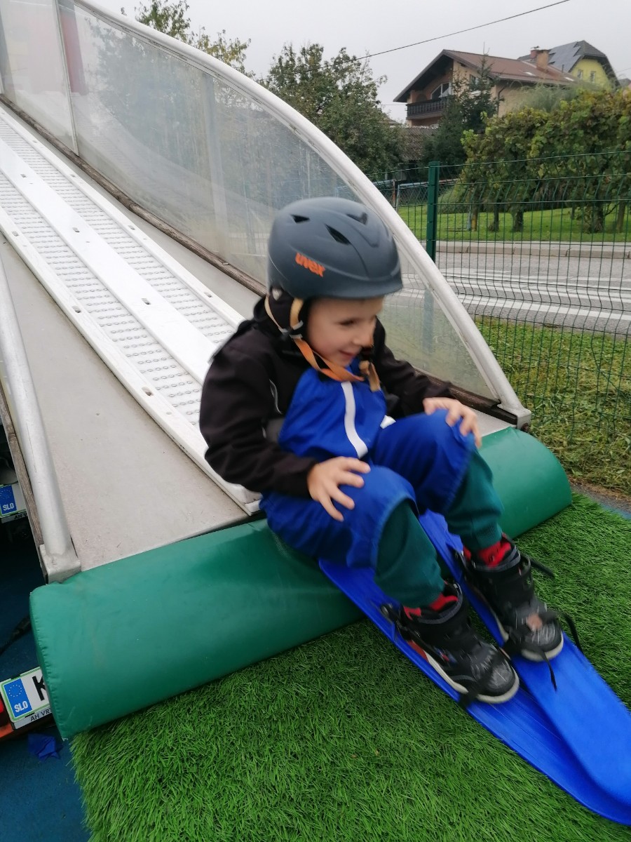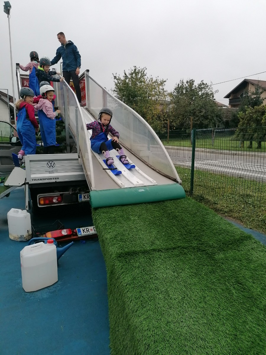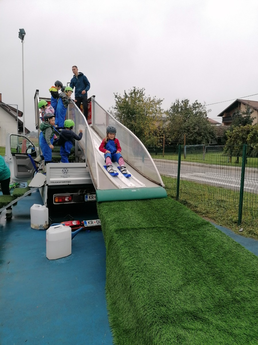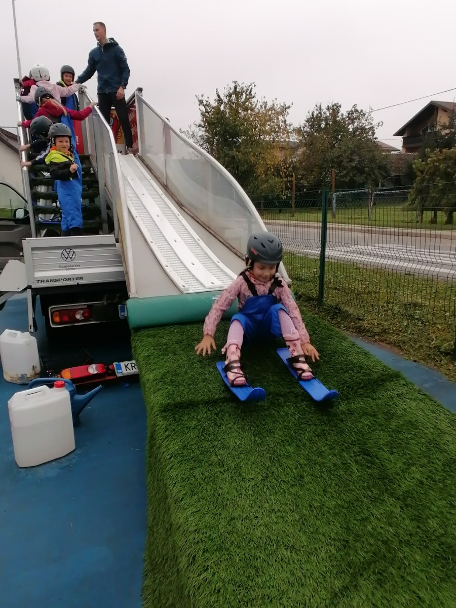 Deževno vreme nas danes ni prav nič oviralo. Mini Planica se je uspešno priselila k nam. Učenci so se pogumno povzpeli na skakalnico in se spustili po njej. Vsi so varno pristali, le redki na nogah, večina pa na ritkah. Priznati pa moramo, da so zelo uživali.