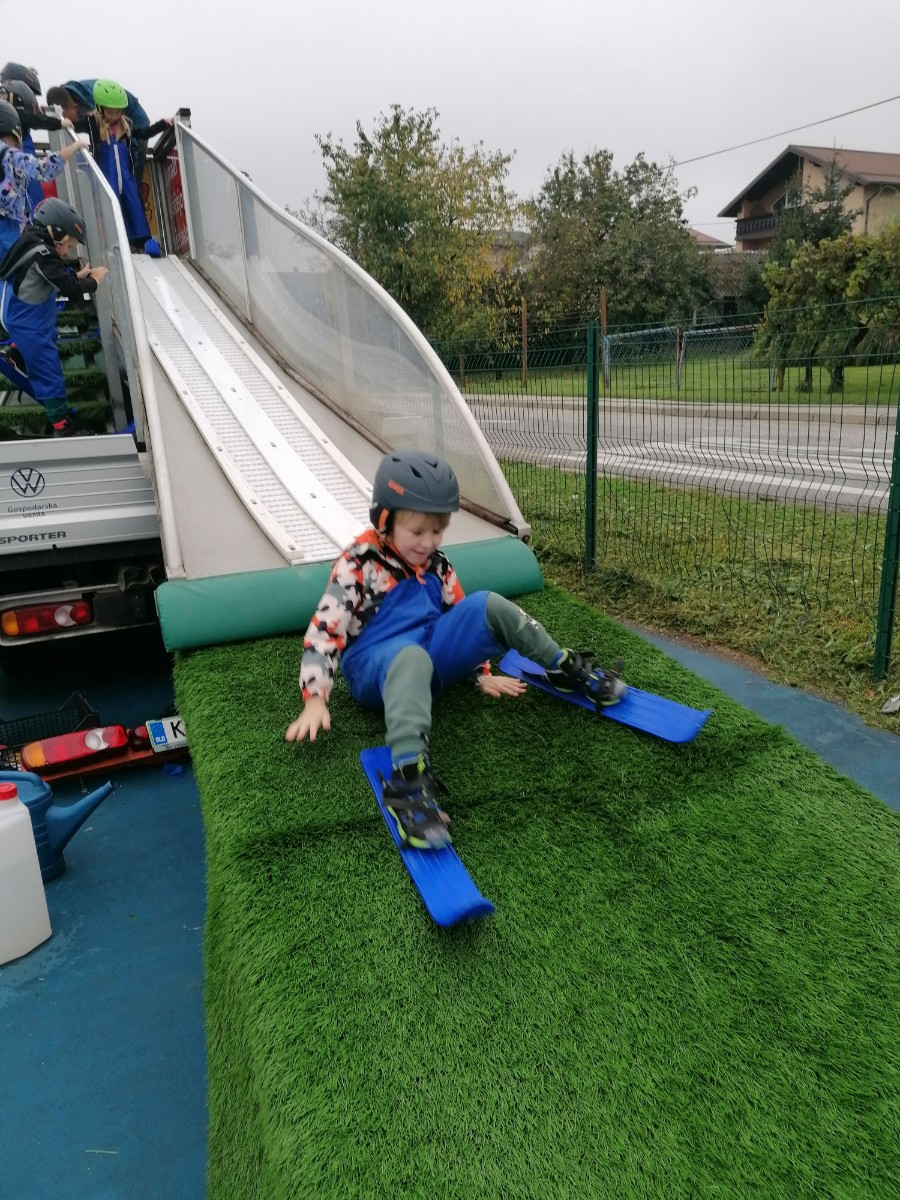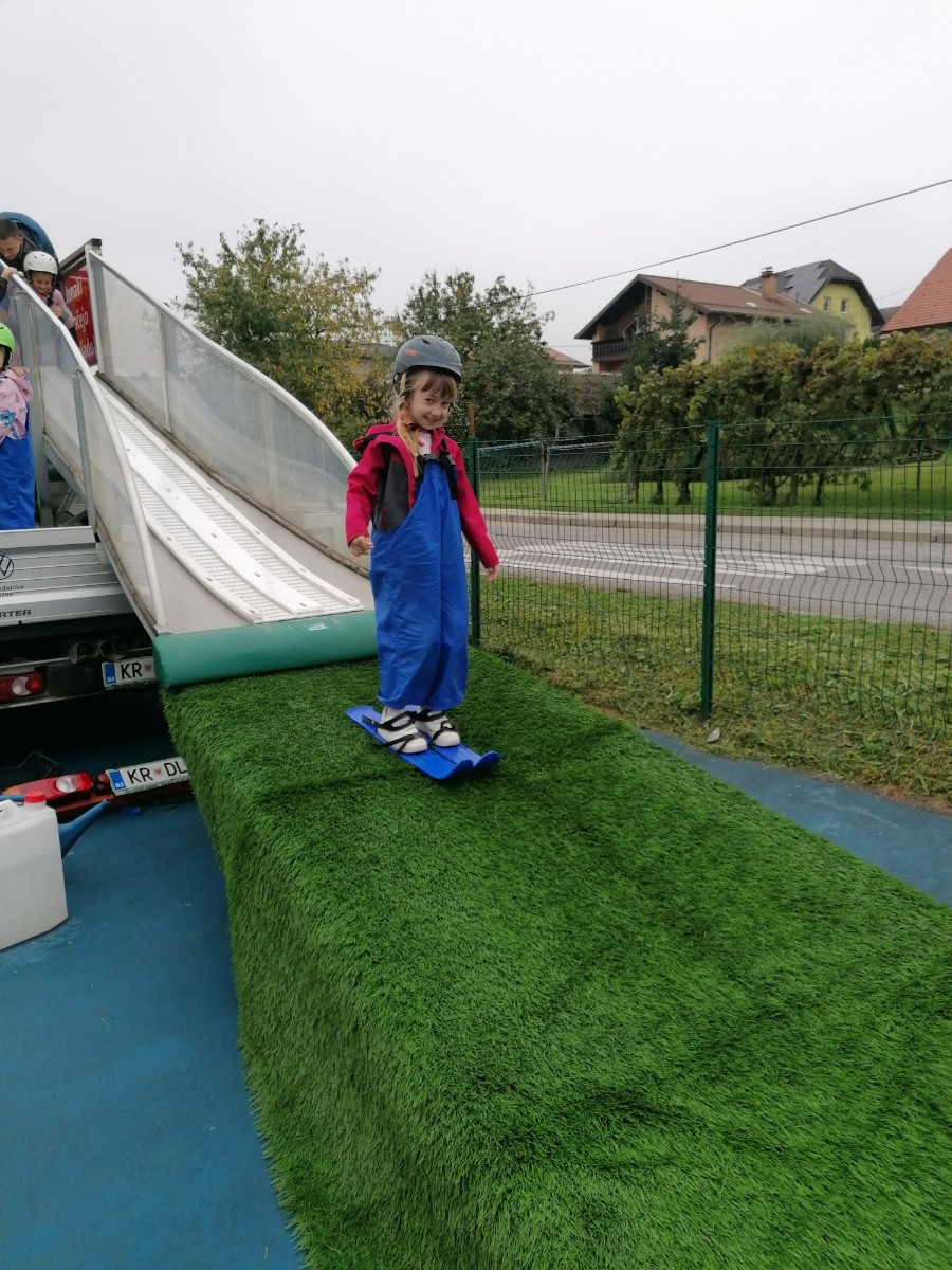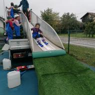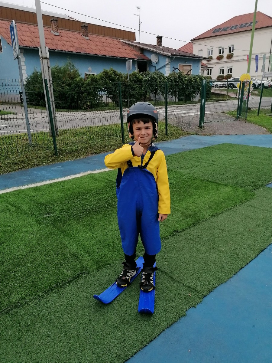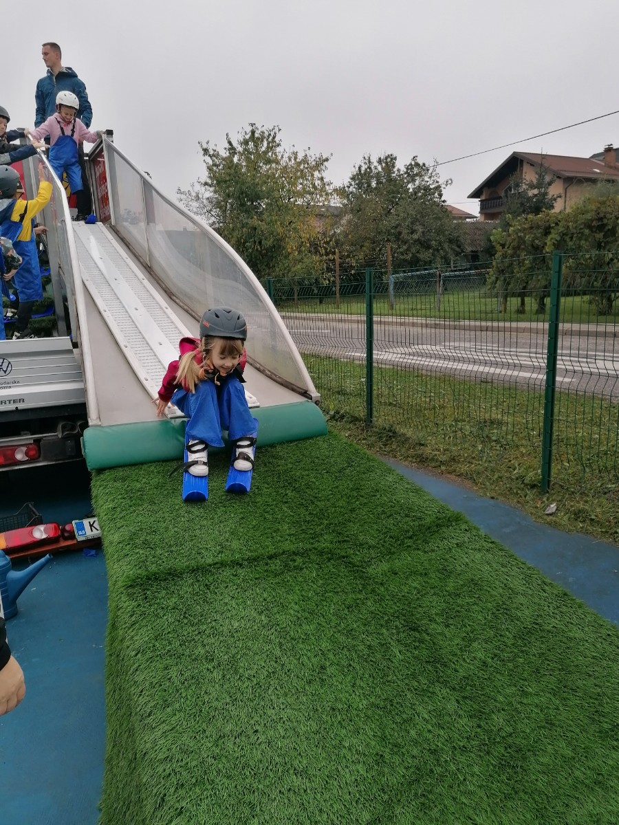 Deževno vreme nas danes ni prav nič oviralo. Mini Planica se je uspešno priselila k nam. Učenci so se pogumno povzpeli na skakalnico in se spustili po njej. Vsi so varno pristali, le redki na nogah, večina pa na ritkah. Priznati pa moramo, da so zelo uživali.