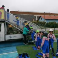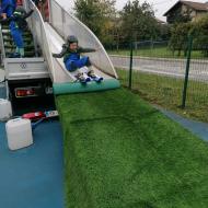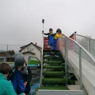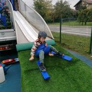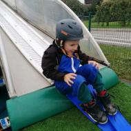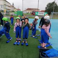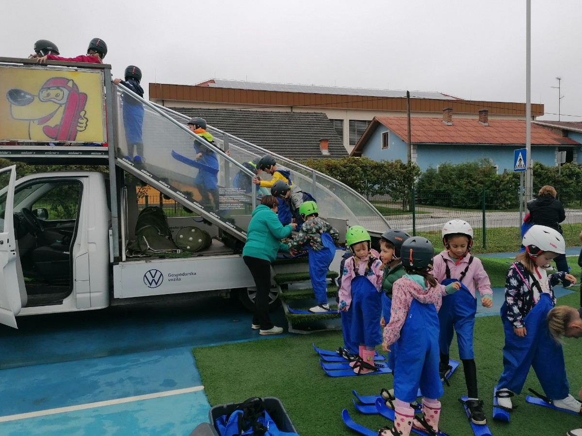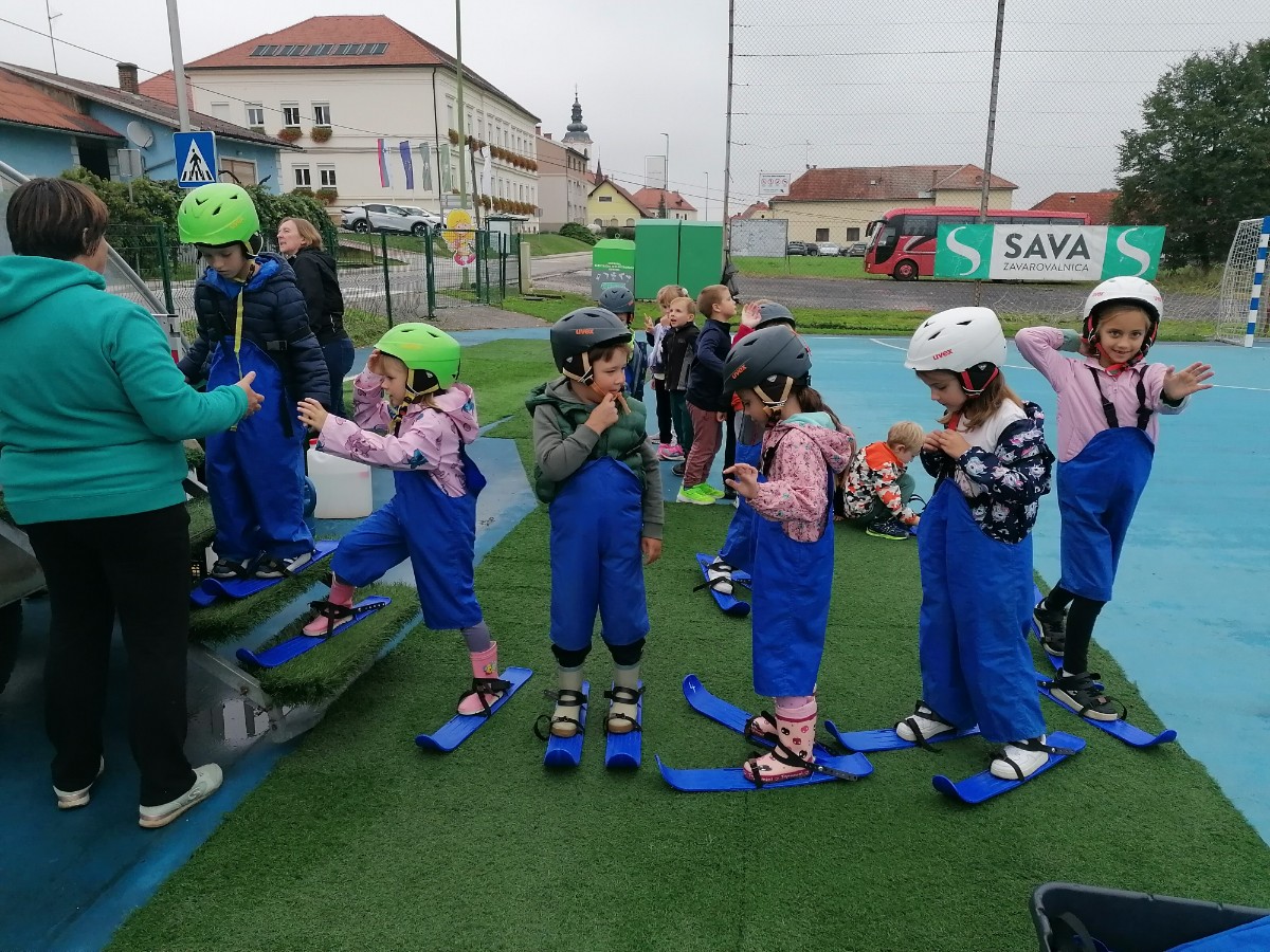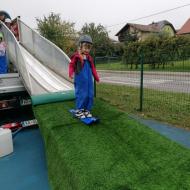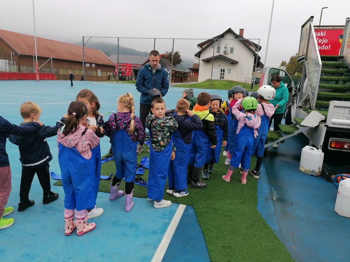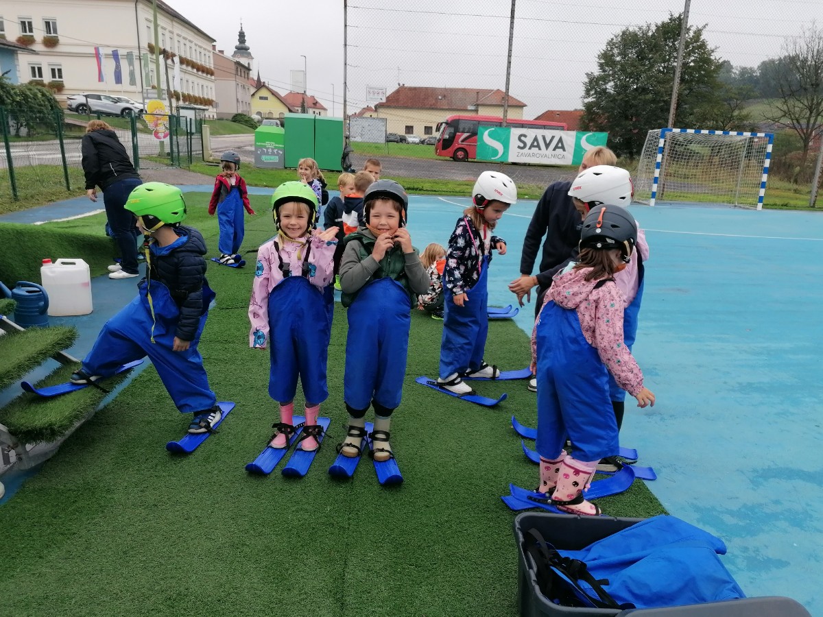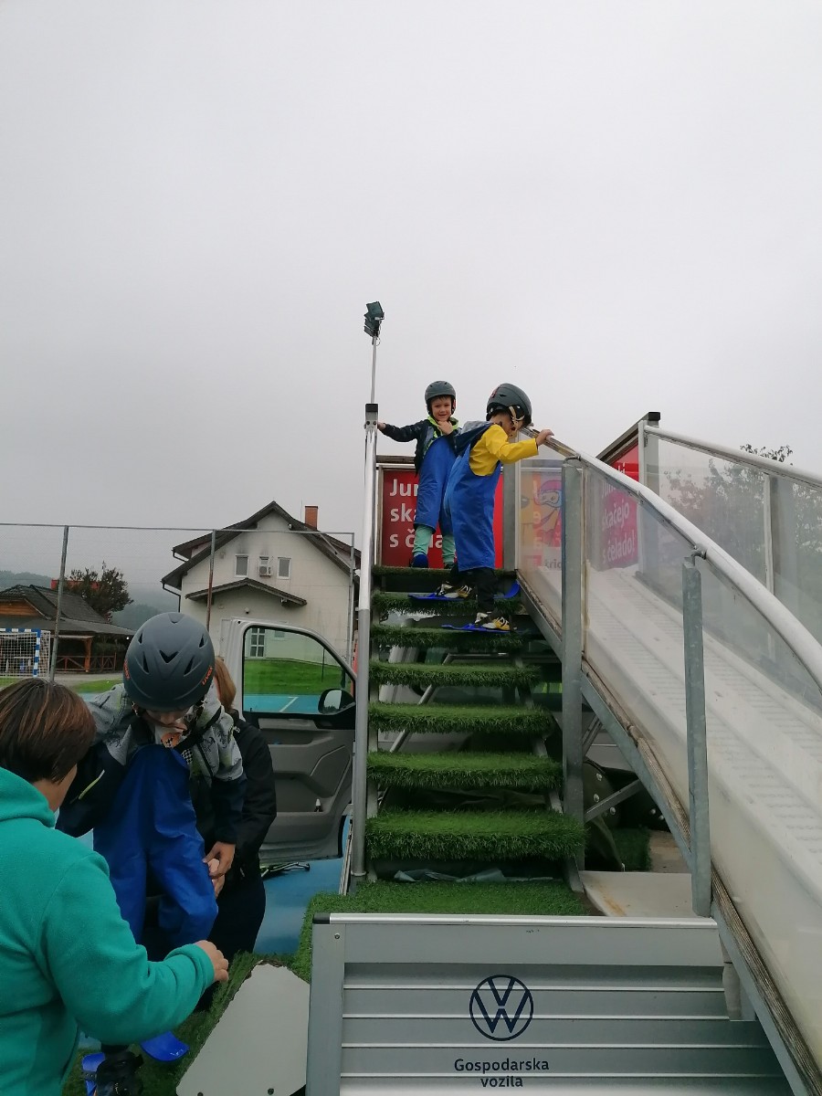 Deževno vreme nas danes ni prav nič oviralo. Mini Planica se je uspešno priselila k nam. Učenci so se pogumno povzpeli na skakalnico in se spustili po njej. Vsi so varno pristali, le redki na nogah, večina pa na ritkah. Priznati pa moramo, da so zelo uživali.
