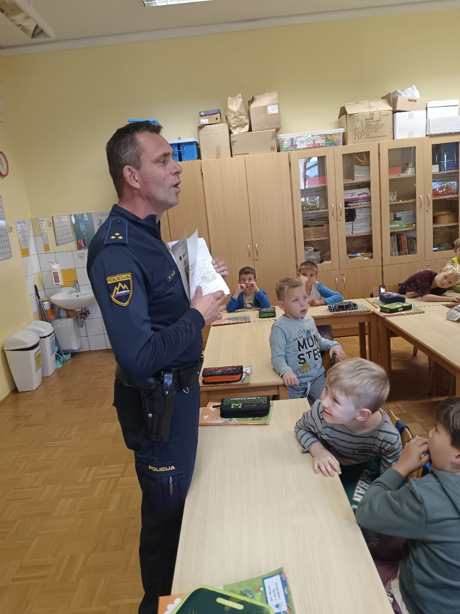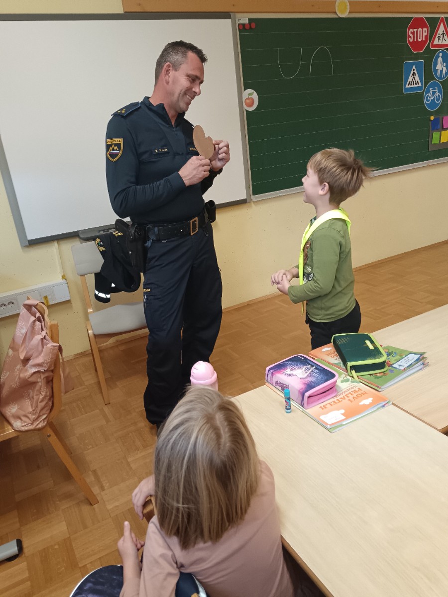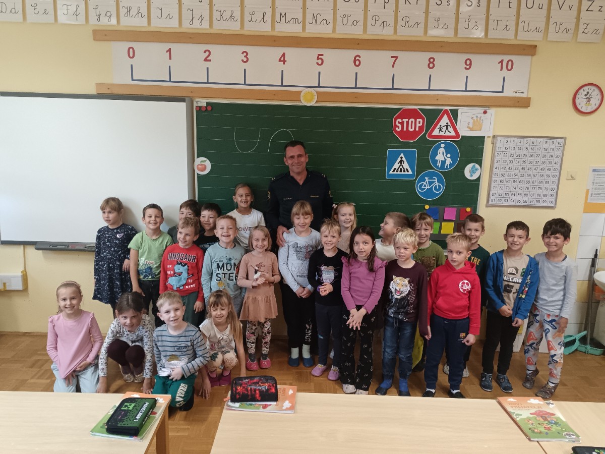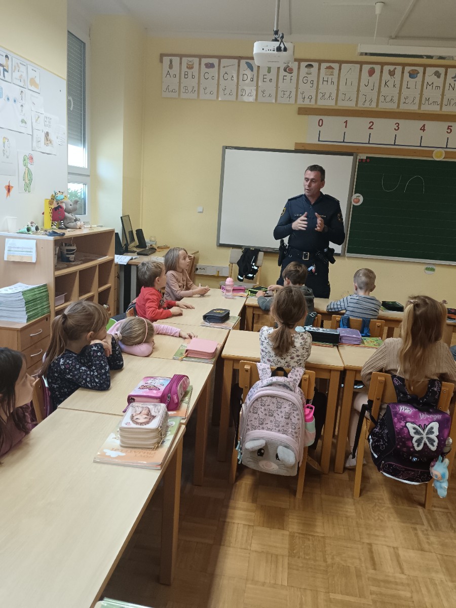 Varnost v prometu je zelo pomembna tema, s katero so se učenci 1. a že srečali. Na učnem sprehodu so opazovali prometno ureditev v okolici šole ter se naučili, kako pravilno prečkati cesto. Vedo tudi, zakaj je tako pomembna rumena rutka okrog vratu prvošolcev. Seveda je pa najbolje, da nam o prometni varnosti kaj pove tudi oseba, ki se pri svojem delu srečuje s takšnimi in drugačnimi prometnimi situacijami, zato smo medse povabili gospoda Kaloha, ki je po poklicu policist. Učenci so z zanimanjem prisluhnili policistu. Vmes so se pojavila tudi zelo zanimiva vprašanja, na katera je pa gospod Kaloh tudi z veseljem odgovoril.
